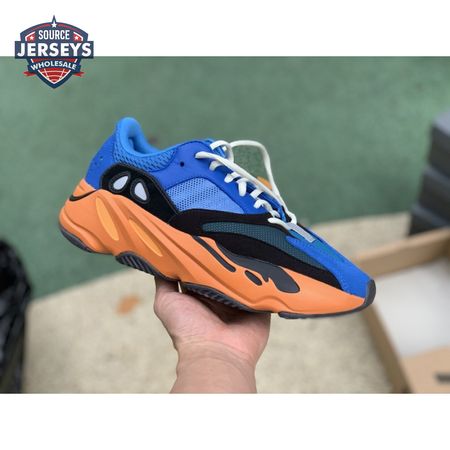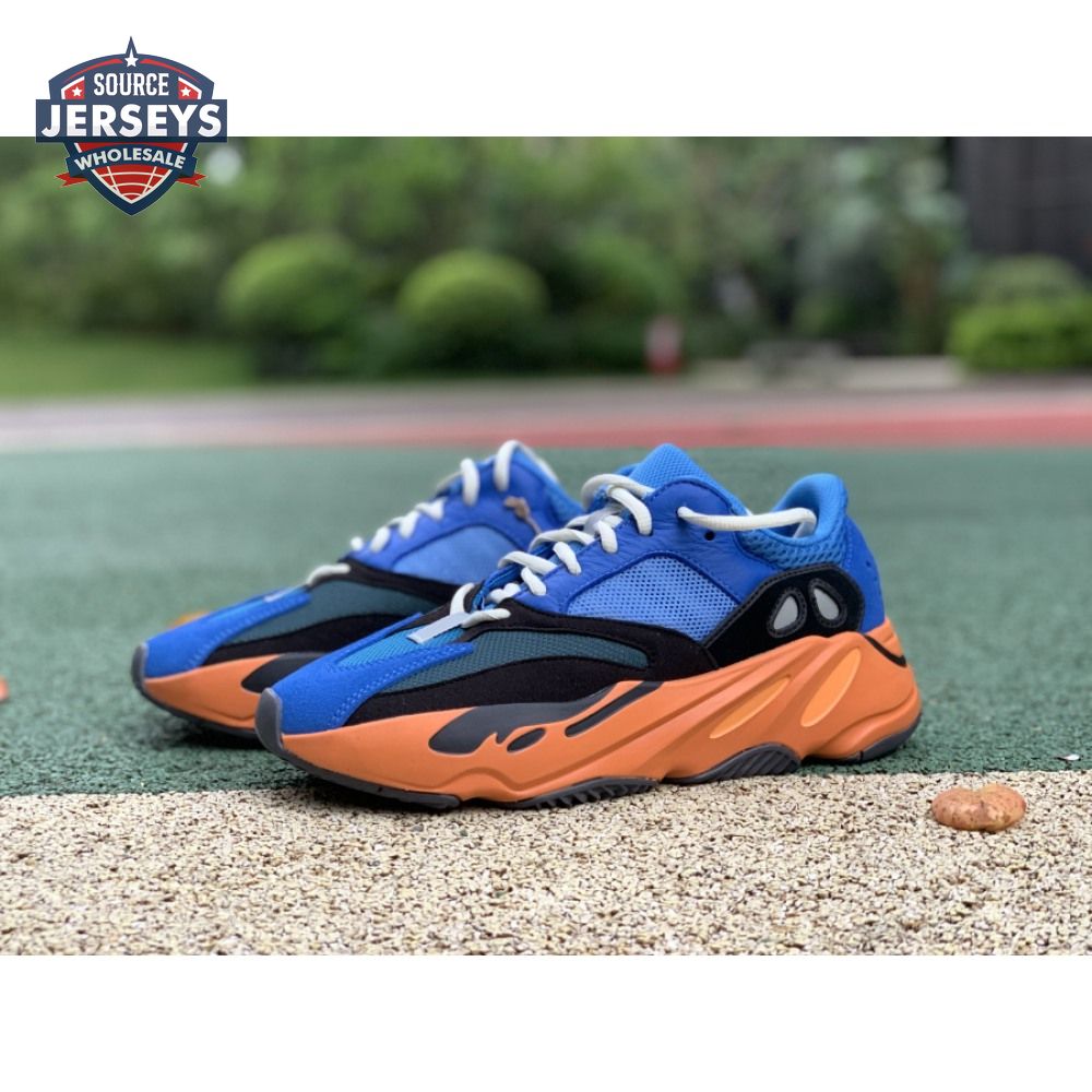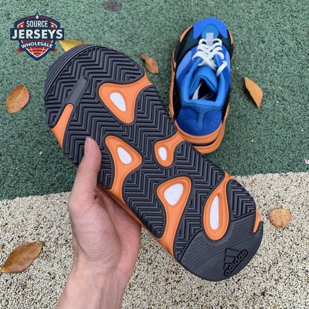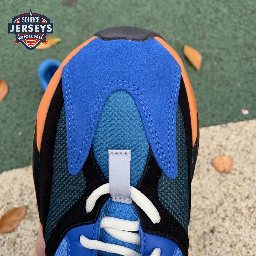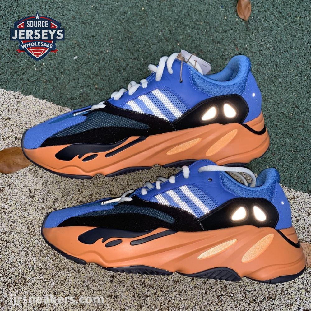 The adidas Yeezy Boost 700 "Bright Blue" uses sharply contrasting finishes to delineate the lifestyle runner"s upper and tooling. The latter pairs sculpted orange sidewalls with a contrasting black rubber outsole, featuring a herringbone traction pattern with cut-out detailing that reveals a drop-in Boost midsole. Up top, royal blue mesh is reinforced with tonal suede overlays at the toe and heel, along with black suede midfoot panels enlivened with reflective detailing.