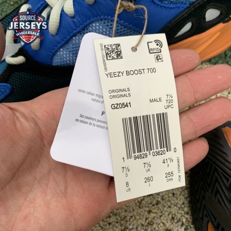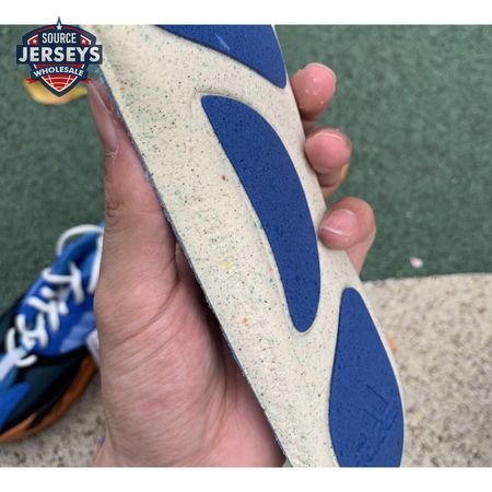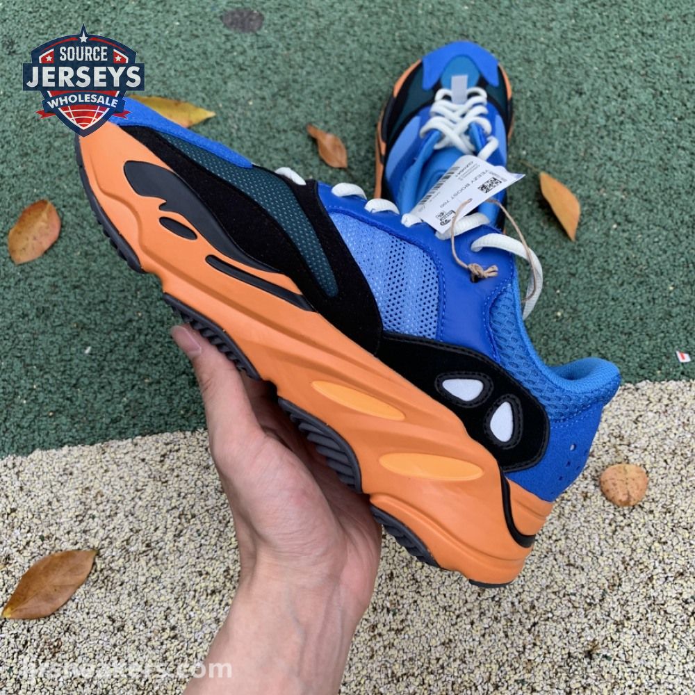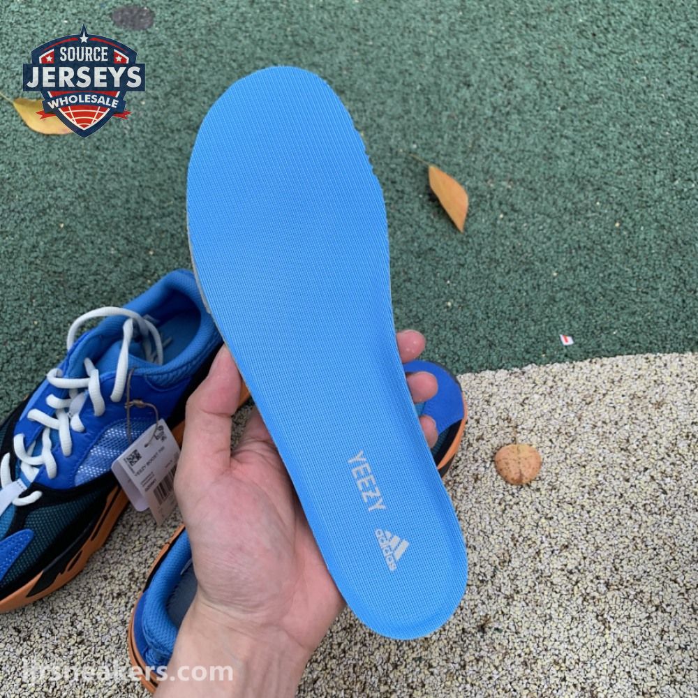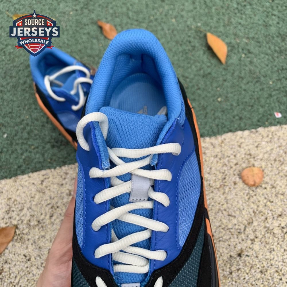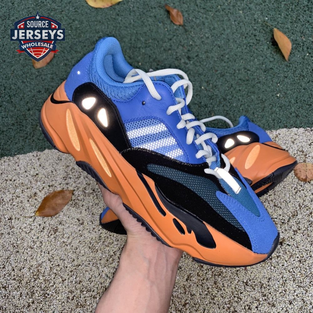 The adidas Yeezy Boost 700 "Bright Blue" uses sharply contrasting finishes to delineate the lifestyle runner"s upper and tooling. The latter pairs sculpted orange sidewalls with a contrasting black rubber outsole, featuring a herringbone traction pattern with cut-out detailing that reveals a drop-in Boost midsole. Up top, royal blue mesh is reinforced with tonal suede overlays at the toe and heel, along with black suede midfoot panels enlivened with reflective detailing.