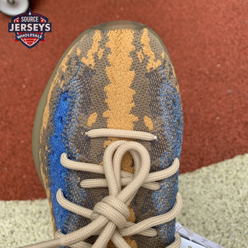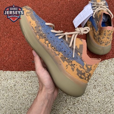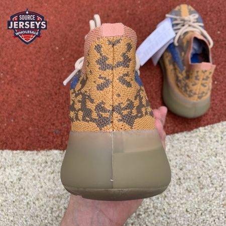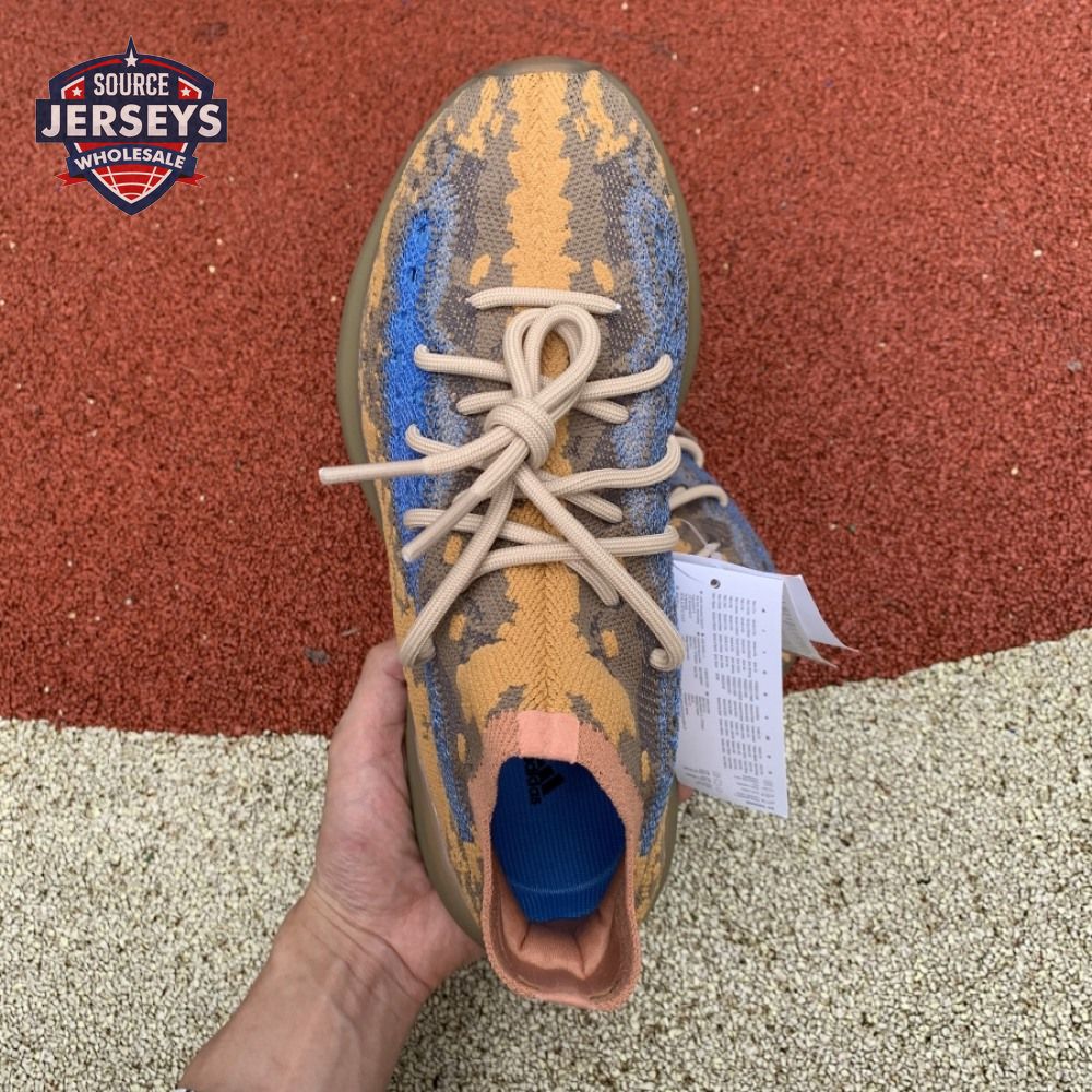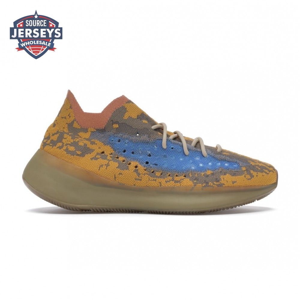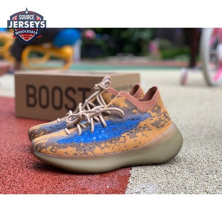 The Yeezy Boost 380 "Blue Oat Non-Reflective" utilizes a sock-like Primeknit upper in a complementary blend of beige and orange tones. The sneaker"s signature translucent monofilament window stands out in a contrasting blue finish, complete with perforated detailing for improved breathability. The one-piece build rides on a full-length Boost midsole, surrounded by a semi-translucent cage and reinforced by a gum rubber outsole.
