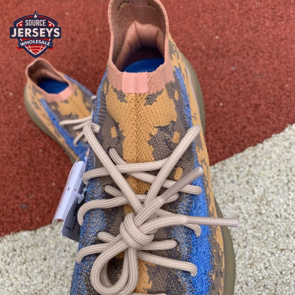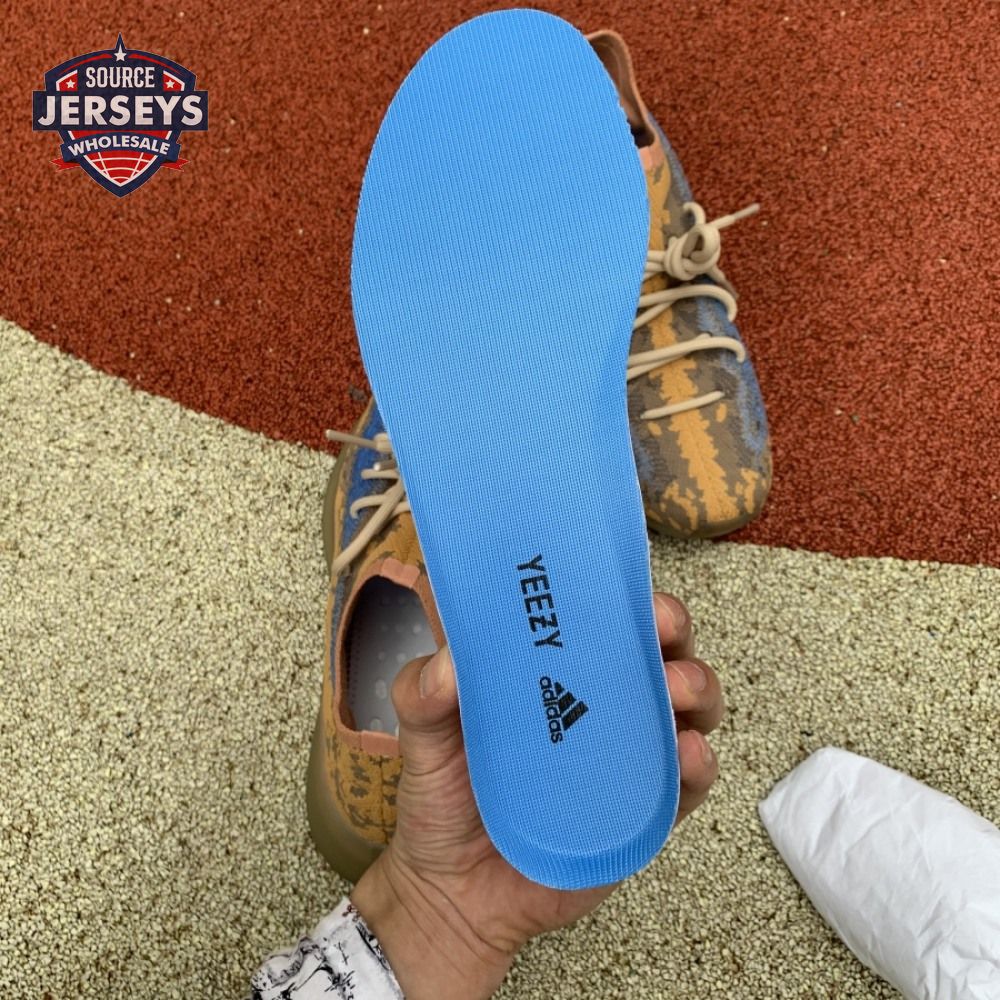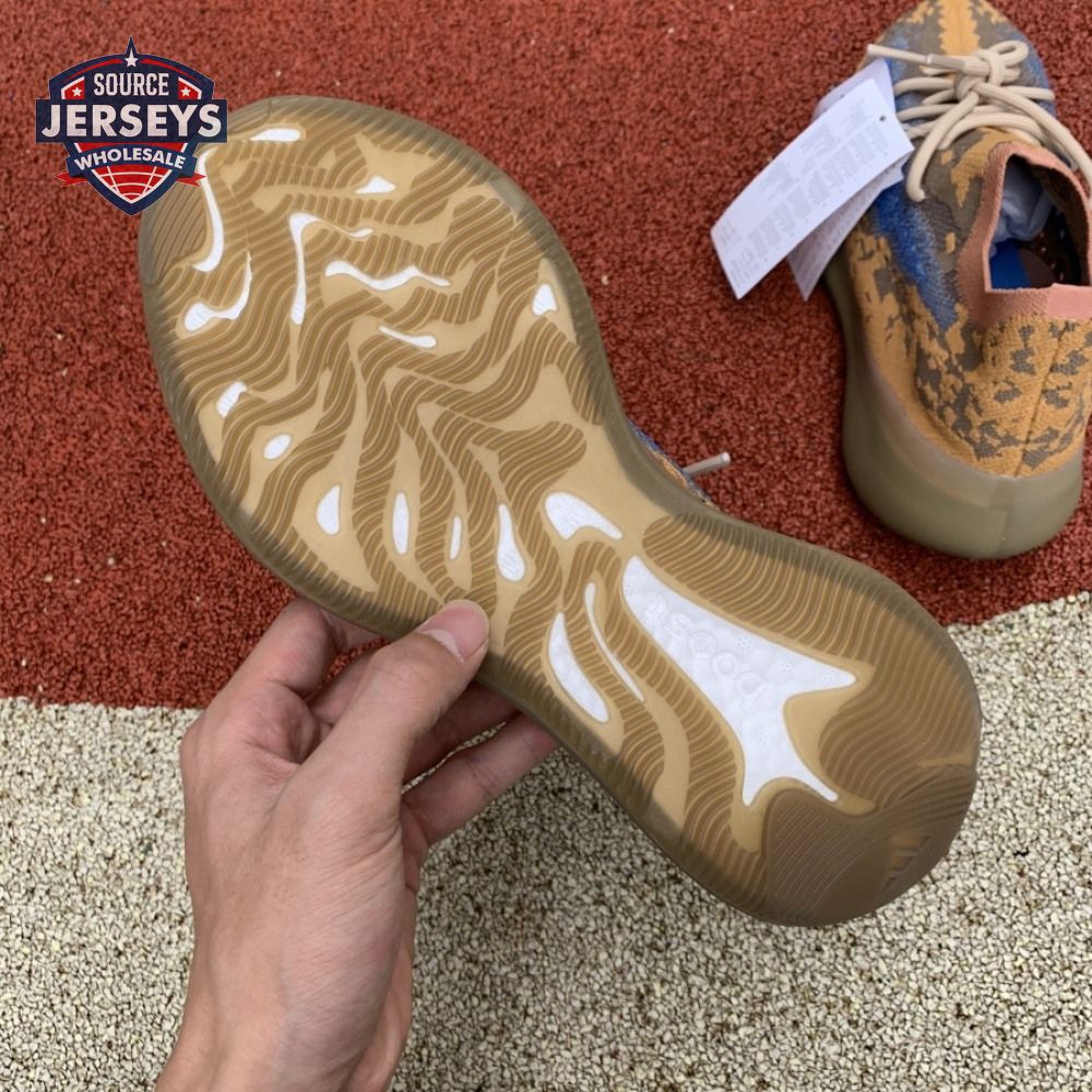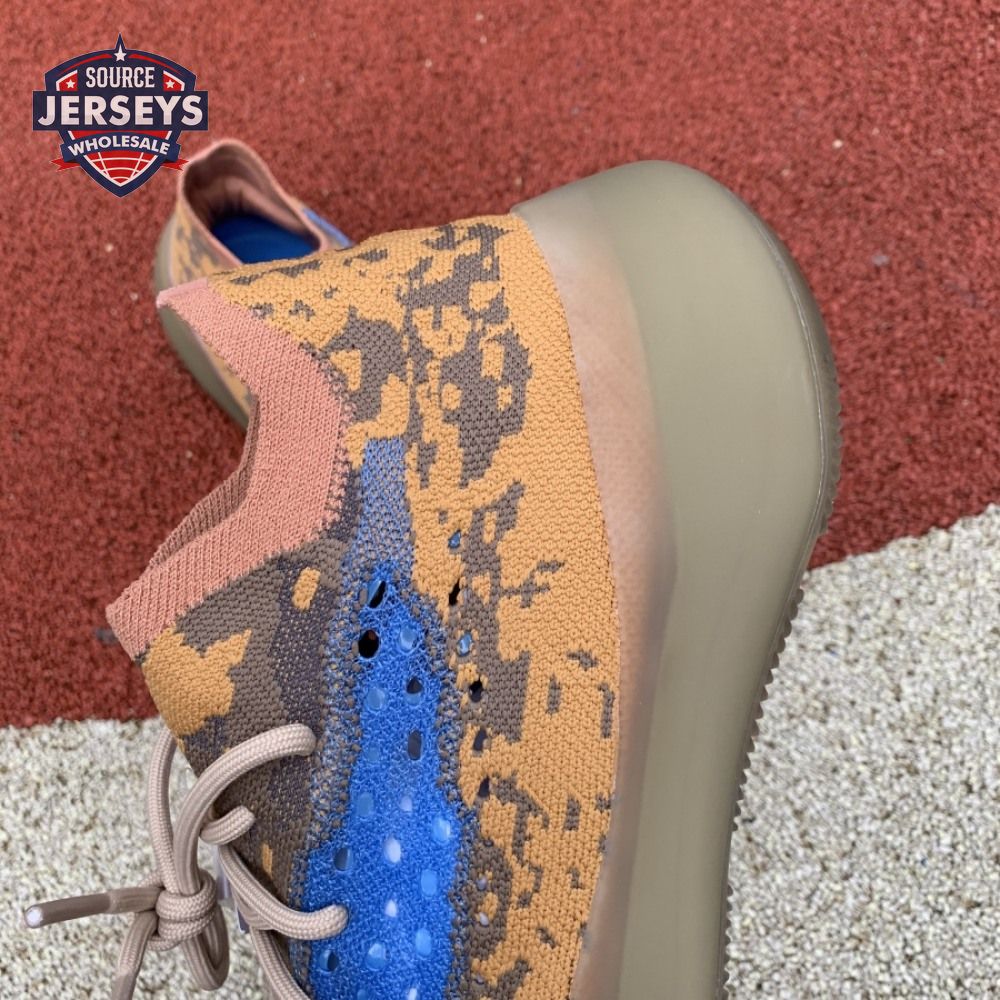 The Yeezy Boost 380 "Blue Oat Non-Reflective" utilizes a sock-like Primeknit upper in a complementary blend of beige and orange tones. The sneaker"s signature translucent monofilament window stands out in a contrasting blue finish, complete with perforated detailing for improved breathability. The one-piece build rides on a full-length Boost midsole, surrounded by a semi-translucent cage and reinforced by a gum rubber outsole.
